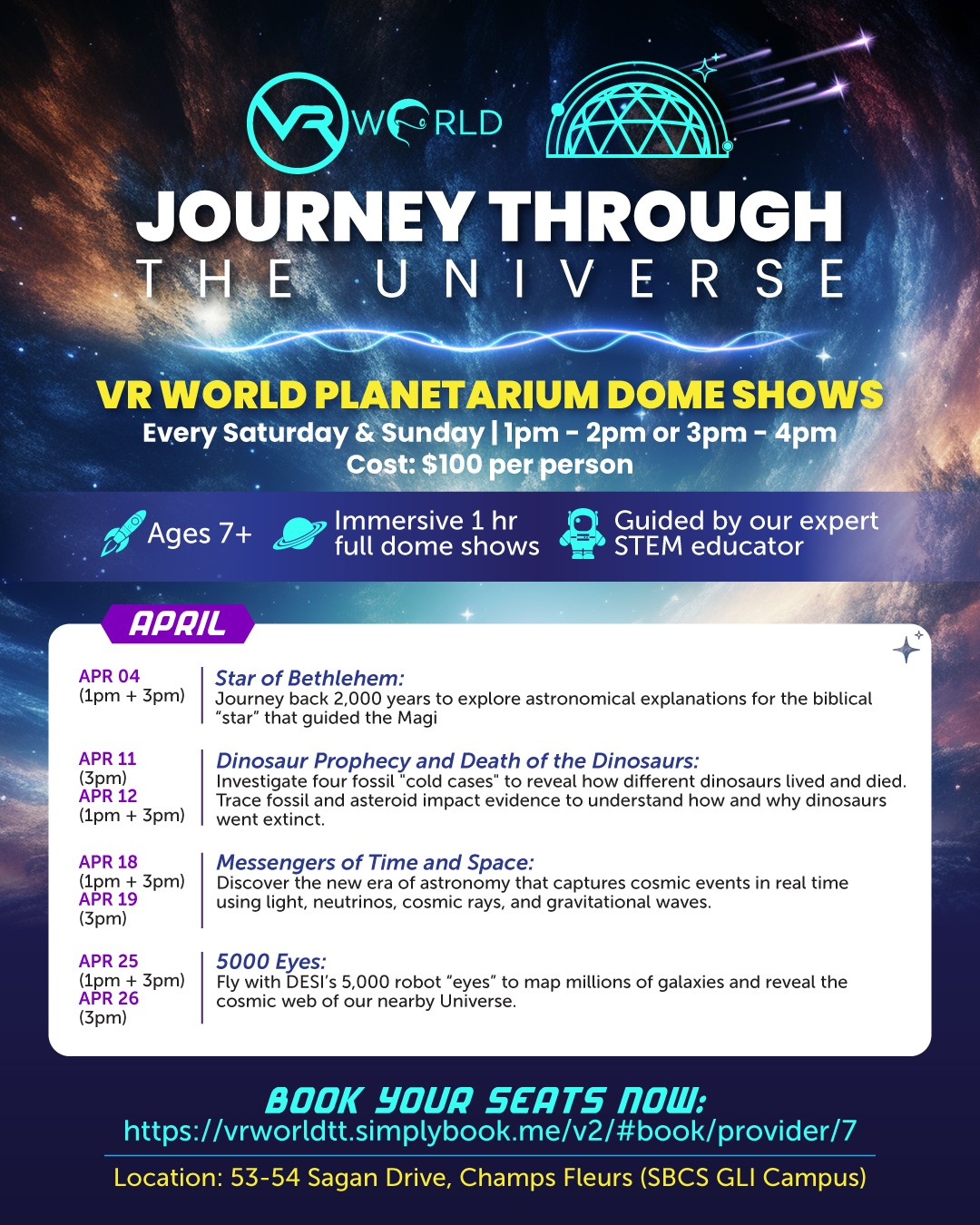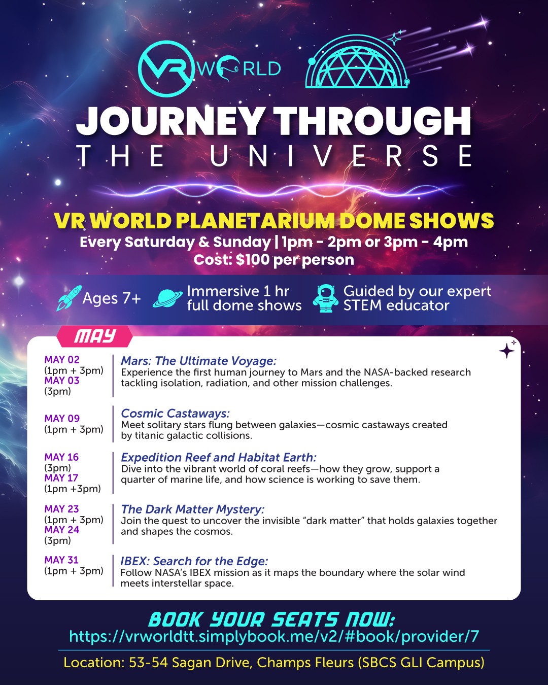 CLICK IMAGE TO ZOOM BOOK SHOW NOW Our planetarium seeks to provide an entertaining and interactive way to learn astronomy. Ticket Price – $100 per person VRWORLD 53-54 Sagan drive Champs fleurs Trinidad & Tobago, West Indies MORE OPTIONS HOME PRICE AND HOURS PLANETARIUM SCIENCE CENTER VR ESCAPE ROOMS VR SHOOTERS MULTIGAME PACKAGE B - VEX MULTIGAME PACKAGE A - HEROZONE MULTISHOOTER PACKAGE - SYNTHESIS VR MACHINES ROOM SCALE BOOTHS TOURS BIRTHDAY PARTIES CAMPS/FIELD TRIPS CORPORATE EVENTS BOOKING INFORMATION