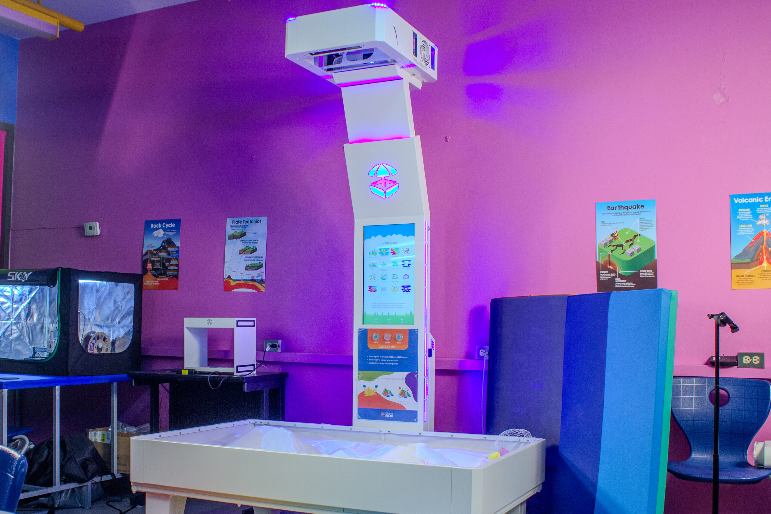 Projects images onto shapes and structures built out of sand to teach kids Topography and Geography in a very fun and interactive way.